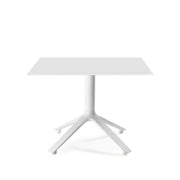 Eex presents a collection of contract tables that also have a certain vocation for domestic contexts, with square or round tops suitable for different uses: either as side or dining table, in the black, white or cool gray finish, in which plastic and metal components blend into a single colour. The top has no sharp corners or edges, and its shape is further emphasized by light, elegant outline. A soft, rounded shape that lets water drops and dew slip away, free of any grooves and unnecessary decorations, ideal for practical and comfortable use.
