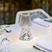 The Lola Lux table lamp adds a touch of elegance and style to any environment it illuminates. Crafted from durable, transparent polyamide, it boasts mirror-like accents that create a unique lighting experience. This lamp features adjustable brightness settings and a remarkable 50-hour battery life. The Lola model is the pride and joy of the Newgarden product line, renowned for its distinctive design and immense popularity throughout Europe, where it remains a top-selling product.