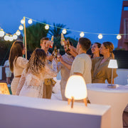 Rocket 20 by Newgarden is an original table lamp with wooden legs, ideal for decorating both exterior and interior spaces. Its combination of wood and polyethylene makes this product a must inside your home. Available for indoor and outdoor use, which includes a remote control with an intensity dimmer to change temperature and light colour.